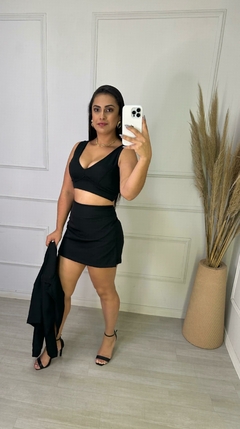 Busto 86 cm, cintura 80 cm e comprimento 34 cm.